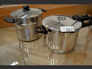FISSLER STAINLESS STEEL PRESSURE COOKER WITH VEGETABLE INSERTS & AUXILIARY SIEVED PASTA INSERT