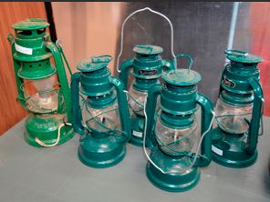 LOT: 4 x MINI PARAFFIN LANTERNS & ANOTHER CONVERTED TO ELECTRICITY