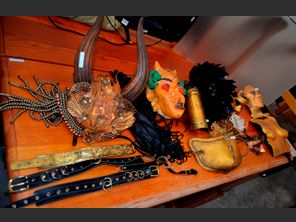 DECORATIVE MASKS, TRIBAL HAT, GOLD PAINTED HALF BUST, etc