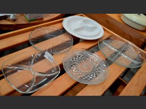 LOT OF 5 SNACK PLATTERS: GLASS & WHITE CERAMIC