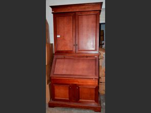 MAHOGANY 2-PIECE, 4-DOOR, FALL FRONT BOOKCASE CABINET, 123 x 73 x 242cm [Repairs to fall front door]