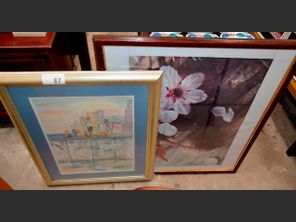 FRAMED WATERCOLOUR "FISHING", 49 x 35cm & A FRAMED FLOWER PRINT, 68 x 48cm