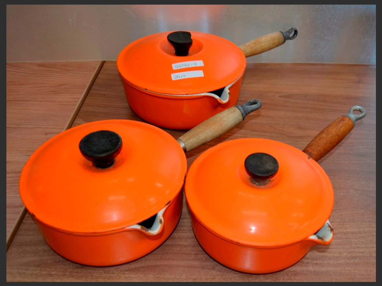 SET OF 3 VINTAGE LE CREUSET SAUCEPANS WITH LIDS [Well used, knob to 1 damaged]