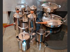 STAINLESS STEEL: SOUP TUREEN, TEAPOTS, CREAMERS, SUGAR BOWL, HOT CHOCOLATE POTS, etc